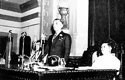 With the 1945 defeat of the Japanese Empire and the re-establishment of the Commonwealth Government, the now-bicameral Congress of the Philippines convened on June 9, 1945, the first time since their election in 1941. During this special session, President Sergio Osmeña addressed lawmakers at their provisional quarters (a repurposed schoolhouse) along Lepanto Street in Manila, and gave a comprehensive report on the work carried out by the Commonwealth Government during its three-year as a government-in-exile in Washington, D.C. Furthermore, he described the conditions prevailing in the Philippines during the Japanese Occupation and an acknowledgement of the invaluable assistance rendered by recognized guerrillas to combined Filipino and American forces in the liberation of the Philippines.