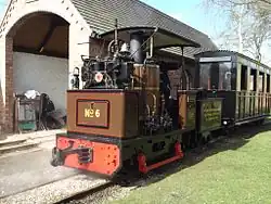 | 6 Howard (previously Paddy) | 2 | 0-4-0VBT | 2 ft (610 mm)[6] | 'Wilbrighton Wagon Works' | 2007 | Amerton Railway | Exhibit | Incorporates older components. In main entrance / ticket hall |