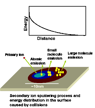 Most of the energy of the primary ions is dissipated into the near-surface region of the solid by a series of binary collisions. This results in ejection (sputtering) of so-called "secondary" particles such as electrons, atoms, molecules, and ions from the surface. In SIMS, it is these secondary ions which are detected and analyzed by a mass spectrometer to produce a mass spectrum of a surface for a detailed chemical analysis of the surface or the solid.[1]