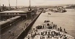 Station Pier, originally known as Railway Pier, was officially opened on 12 September 1854.[1] The 4.5 kilometre Port Melbourne line from the pier to Flinders Street station via the Sandridge Bridge was opened at the same time to facilitate the transport of passengers and goods, and was the first significant railway in Australia.[2] The pier was kept busy throughout the 1850s, due to the increased passenger traffic created by the gold rush. In 1861, the pier was extended to a length of 661 metres, in order to accommodate the ever-increasing traffic associated with the number of people settling in Victoria.[1]