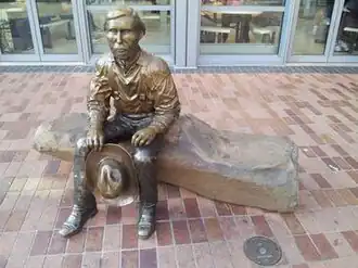 Eugene Skinner is an outdoor bronze sculpture of the founder of the city named after him, installed outside the Eugene Public Library in Eugene, Oregon, in the United States. The life-sized statue was created by local artist Jim Carpenter, who estimated Skinner's height to be around five feet, four inches, based on the distance between the butt and trigger of the rifle which appeared in photographs of the pioneer.[1] Skinner is depicted sitting with a hat in his hand; the sculpture rests on a basalt block, quarried from Skinner Butte.[2] Carpenter has said of the statue: