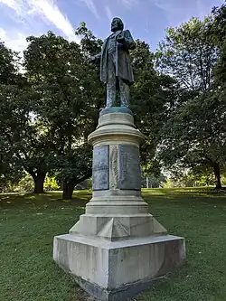 The location of the statue was controversial. The committee initially proposed located it in Plymouth Park in the Third Ward, in the middle of Rochester's black community. However, local residents opposed it and other city residents wanted a more central location. The final decision was to erect it by the New York Central train station.[10] The initial unveiling was scheduled for September 14, 1898, but the organizers learned on September 12 that the statue was not ready. Regardless, almost 3,000 people gathered on September 14 to observe a ceremony in which the monument was formally turned over to the city.[12]: 82 In his speech, Mayor George E. Warner said: