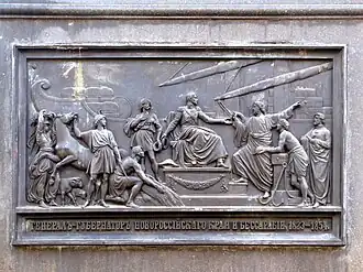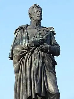 The Statue of Graf Vorontsov, Odessa, is a sculptural and former[1] monument established in 1863 on the Sobor Square in Odesa in honor of Mikhail Semyonovich Vorontsov, Field Marshal, the General-Governor of Novorossiya Region and plenipotentiary governor of Bessarabia who was a graf until 1845, then knyaz from 1845. The sculptor is Friedrich Brugger, the pedestal was made under the command of Sevastopol 1st guild merchant P.A. Telyatnikov.[2] and the architect was Francesco Carlo Boffo.[3] On 11 November 2023 the monumental status of the sculpture was scrapped.[1]