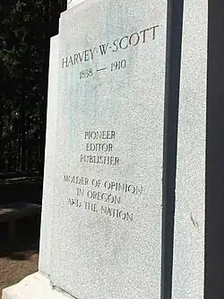 - ^ a b c d "Statue of Editor Will Be Colossal: Larger Memorial Planned to Harvey W. Scott". The Sunday Oregonian. October 5, 1930. p. 6.