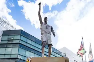 On February 8, 2024, The Los Angeles Lakers unveiled a 19-foot statue of deceased retired NBA player Kobe Bryant outside of the Crypto.com Arena.[6] The statue, sculpted by Julie Rotblatt-Amrany,[7] depicts Bryant's right index finger skyward pose after his famous career-high 81-point game on January 22, 2006, against the Toronto Raptors, with his name and scorer's report from that game etched into the statue, representing one of his most iconic games during his career.[8] The back of the statue contains a quote from Bryant, stating,