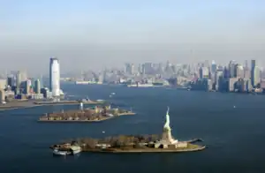 The Statue of Liberty is a world-famous symbol of freedom, given in 1886 by France to the United States in celebration of American Independence. Nearby Ellis Island was the first stop for millions of immigrants to the U.S. in the late 19th and early 20th centuries.[21] The national monument recalls this period of massive immigration to the United States.[22]