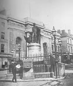 The statue was originally erected on the site of the Old Cross, a two-storey building (a meeting hall over an open space), built in 1703 and demolished in August 1784. It stood outside the Market Hall (opened adjacent to it in 1835). Since 25 April 1952 it has had Grade II* listed status.[1]