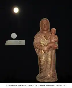 In 1622, Easter Sunday fell on 27 March.[5] The procession set out with the Most Holy Sacrament of the Altar, accompanied by the feretories of Our Lady of Miracles and St. Anthony, with all possible pomp. When the canopy of the Most Holy Sacrament began to move out of the church, the full moon, in the sight of all, deviated from its customary orbit and came down, maintaining a proportionate altitude, about six paces in front of the Most Holy Sacrament. It moved along all the streets of Jaffna, as if to accompany the King and Queen of Heaven.