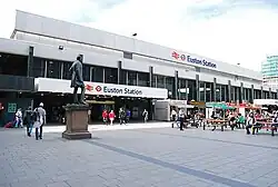 The statue of Robert Stephenson was erected on a red granite pedestal outside Euston railway station in 1871, originally sited between the entrance lodges to the station precincts. It was moved to the east side of the station when it was redeveloped in the 1960s, and moved again in 2008 when further redevelopment was proposed to stand to the west side of the station forecourt. The statue is one of few surviving elements of the original station after it was redeveloped in the 1960s, and it was listed at Grade II in 1974.[8][9]