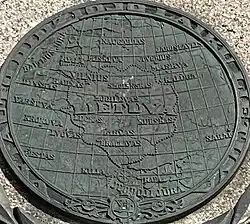 The reconstructed pedestal features a bronze map of the Grand Duchy of Lithuania at the time of Vytautas the Great, the only surviving piece of the original monument.[2] That map displays its territory extending all the way to the Black Sea and indicating within it the cities of Bratslav, Kyiv, Kursk, Lutsk, Mogilev, and Smolensk, which are now part of Belarus, Russia and Ukraine. It is framed by the inscription "Lietuvos galybės kūrėjui", literally a dedication "to the creator of Lithuanian power", and the dates 1430 and 1930 referring to the 500th anniversary of Vytautas the Great's death.