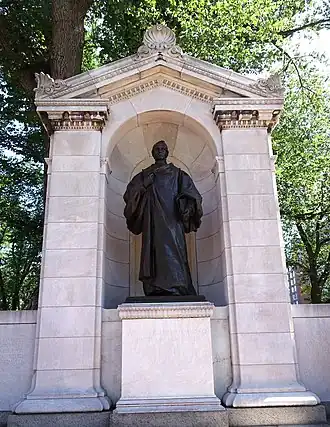 A statue of William Ellery Channing is installed near the intersection of Boylston and Arlington in Boston Public Garden, in Boston, Massachusetts, United States. The statue stands under a marble structure.[1]