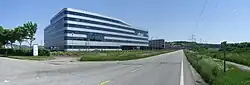 The airport was located in the Forus area, which is at the intersection of three municipalities: Stavanger, Sandnes and Sola.[22] The site is that of a former lake, Stokkavatnet, which had been drained to create agricultural land.[23] The Luftwaffe facilities at Forus consisted of three runways. The main one measured 1,950 by 80 meters (6,400 by 260 ft) and aligned southeast–northwest. It was crossed, not quite at a right angle at its southern end by a runway dimensioned 1,200 by 40 meters (3,940 by 130 ft). Another ran east–west and measured 1,200 by 80 meters (3,940 by 260 ft) and crossed the main runway at the northern end.[6] Forus was connected to Sola by way of a 3,650-by-18.1-meter (11,975 by 59 ft) taxiway, named Løwenstrasse, allowing Forus and Sola to exchange aircraft. It connected to the main runway at the south[10]