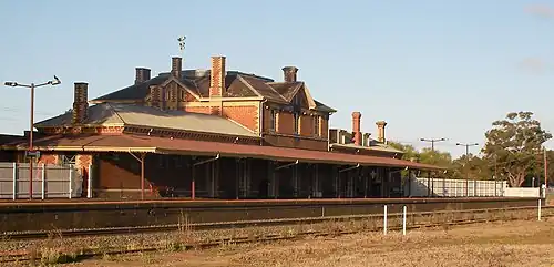Stawell railway station is the town's only operating rail station, having been reopened for The Overland passenger services between Melbourne and Adelaide in 2011. V/Line offer up to 60 seats on each Overland service for V/Line passengers travelling in Victoria. As at December, 2019, it operates twice weekly; on Mondays, and Fridays for Melbourne and on Tuesdays and Saturdays for Adelaide.[20][21]