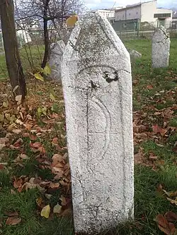 There are non-figural motifs on over 200 nišans: hand, crescent moon, half apple, rosette, club,[5] and motifs of war, hunting and tournaments. A saber appears, while a sword appeared exclusively on stećaks.[4]