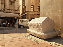 Although the name stećak is meant to represent high monolithic standing stones (i.e. sanduk and sljemenjak form), in the 20th century the word stećak was accepted in science as a general term, including for plate tombstones (i.e. ploče).[9][16] The original reference to the word stećak itself is uncertain and seems to be a modern invention as it can only be traced from the note by Ivan Kukuljević Sakcinski from 1851,[17] dictionary by Vuk Karadžić from 1852 (in the first edition from 1812 the term did not exist), although he contradicted himself as the commoners from Zagvozd called them starovirsko ("of the old faith"),[18] dictionary by Bogoslav Šulek from 1860 and so on,[19] while academic dictionaries mention it only from 1956/58.[20] It is believed that the term was usually used in East Herzegovina and in the area of Stari Vlah in Serbia.[18] Until the very early 20th century there was wandering in terminology, and some scholars proposed general terms like nadgrobni biljezi (gravestone markers) and mramorje (marble) to be more appropriate.[9]