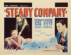 Steady Company is a 1932 American pre-Code action film directed by Edward Ludwig, written by Edward Ludwig and Earle Snell, and starring Norman Foster, June Clyde, ZaSu Pitts, Henry Armetta, J. Farrell MacDonald and Maurice Black. It was released on March 14, 1932, by Universal Pictures.[1][2][3]