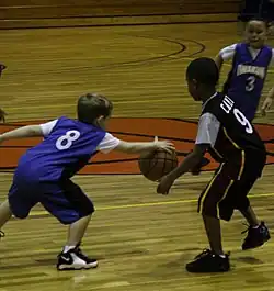 In basketball, a steal occurs when a defensive player legally causes a turnover by their positive, aggressive action(s).[1][2] This can be done by deflecting and controlling, or by catching the opponent's pass or dribble of an offensive player. The defender must not touch the offensive player's hands or otherwise a foul is called.