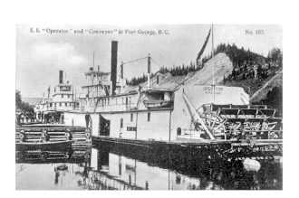 When the Grand Trunk Pacific Railway reached Tête Jaune Cache in 1912, they were able to use their own sternwheelers to transport workers and supplies up and down the river. The Operator and the Conveyor had worked on the Skeena River and were dismantled at Victoria. Their machinery and boilers were hauled up by rail to Jasper, Alberta and then hauled by mule wagon to Tête Jaune Cache where they were reassembled for use on the stretch of the river between there and Fort George. Their captains were Captain 'Con' Myers and Captain Jack Shannon, respectively. When their work was completed their machinery was recycled and the hulls were left at the shore of the Fraser River near Prince George.[9]