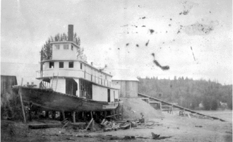 For ten years the area was without steamer service until the Charlotte was built by Alexander Watson for the North British Columbia Navigation Company in 1896. The N.B.C.N.C was organized by Senator James Reid of Quesnel, Captain John Irving of Victoria and Stephen Tingley of Ashcroft. Tingley, at this time had been the owner of the BC Express Company for eight years, having been the most famous of the "bull whips" of the Cariboo Road. They hired Captain Frank Odin to pilot her. He was her captain until 1906, when Captain Owen Forrester Browne became her pilot.[2] The Charlotte was the only steamer on the upper Fraser until 1909 when it was announced the Grand Trunk Pacific Railway would be crossing the Fraser River at Fort George. The Quesnel was launched by Telesphore Marion, a pioneer merchant from the town of the same name. It would become the fourth sternwheeler to work the upper Fraser and would also be the last. Her pilot was Captain DA Foster.[3]