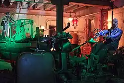 Inside, the gallery presents a theme of a dark post-apocalyptic vision of a future "as it might have been". Contraptions and machinery featuring heavy use of copper, gears, pipes, gas cylinders, as well as an ensemble of skeletal sculptures are lit by flickering lights and accompanied by projectors and background sounds. Two large darkened rooms and part of the building's basement house a variety of old industrial and medical machines remade into "aetheric" devices. The exhibits include some large machines, such as a steam tractor, periodically emitting steam, and a boat with a grim reaper.