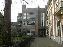 The first rector recorded is Meester Gheraerde de scoelmeester in 1301.[3] In 1389 the city was given the privilege of appointing the rector together with the pastor of the Bavo.[3] The rector was paid by the fees paid by students. He also took in students from outside the city and received extra fees for room and board. From his income, he paid the teachers (ondermeesters) himself.[3] The basis for education was the artes liberales, whereby parts of the Trivium were given in Latin and the Quadrivium included music, since the choir boys needed to sing in church.[3] For boys studying theology, Hebrew lessons were given in addition to Latin (Greek only became available from 1522).[3] Students wanting to continue their studies, needed to leave the country before the Leiden University was founded in 1579. According to the archives of the Heilige Geest, a religious institution formerly located at what is now the Hofje van Oorschot, they had a fund from 1502 to 1577 (the Satisfactie) for sending good students to Cologne to further their studies there.[3] In 1553, when the school had been run by Junius, they even petitioned Charles V, Holy Roman Emperor for the right to found a university in Haarlem, but this was never answered.[3] After the Satisfactie van Haarlem in 1577, the books of all the monasteries and cloisters in Haarlem were given to the Latin school and the rector Cornelis Schonaeus (1540–1611) took two weeks to draw up the inventory list.[3] This same Schonaeus was the one who was in charge of moving the school from the schoolsteeg to the current location in 1583.[4] He almost lost his job when the council decided to start a collegie or university there, but perhaps because Leiden had already been founded, this never happened. He did complete a major reorganization of the school that was then placed in the hands of his successor, Theodorus Schrevelius.[4]