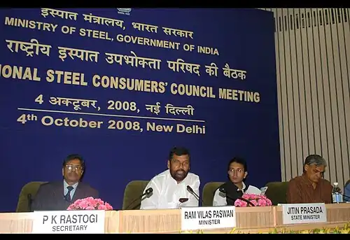 The Steel Consumers Council is a group under the Ministry of Steel, chaired by the Cabinet in charge of the department. India is the world's third-largest producer of crude steel, and the council works with steel producers to ensure both the supply and demand of the steel industry.[1][2][3] It also advises the Ministry of Steel and assists the Government of India on matters and policies concerning the Indian steel industry. In 2004, alarmed by the recent rise in steel prices, the Union Steel Ministry had proposed setting up of an independent regulator to monitor and fix the prices of steel. It had also supported a demand to abolish the present 5 per cent import duty on scrap this was announced by Ram Vilas Paswan Minister in charge of Ministry of Steel at the 18th national Steel consumers council in 2004.[4][5][6]