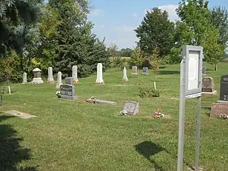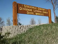 The history of Steelesville Cemetery dates back to the 1860s when the first Swedish immigrants to the area arrived and settled in the farming community south of Dassel, Minnesota. Most all of these settlers arrived with personal belongings of little value, but rich in Christianity along with their deep-seated trust in God. On February 13, 1873, a meeting was called and held at the house of Sven Harling for the purpose of discussing the advisability of organizing a new Lutheran congregation. Out of that meeting came a congregation named “The Swedish Evangelical Lutheran Congregation of Steelsville, Meeker County, Minnesota”. At the first annual meeting, held January 2, 1874, it was reported that a piece of land had been procured and a church building erected without debt, in Section 11, a place better known as the Dahlman Skog. At this location ten children and three adults members were buried. Two and a half years later the road past the church was closed. As a result, on September 20, 1876, Sven Harling, although never a member of the church, agreed to donate one acre of land in the southwest corner of his Section 3 farm and a decision was made to move the log church building. In early 1877 the church building was relocated to the site. The fee ownership of the land was then transferred on February 4, 1878.[1] The church building was placed in the southeast corner of the one-acre lot as the road at that time, better known as the Dassel-Hutchinson Stage road, was then located on the east side of the present day Steelesville Cemetery. Shortly thereafter, in the same year, a petition was presented by ten men of the congregation, to relocate the congregation and build a new church building in Dassel, Minnesota. On September 26, 1877, a congregational decision was made: 1) that the högmässo gudstjänster, or the högmässo worship be held in Dassel, Minnesota after the beginning of 1878; 2) that services on Sunday afternoons and week days be held in Steelesville; 3) that even after the congregation is moved to Dassel, this property (Steelesville Cemetery) shall always be kept – the grounds for a cemetery and the building for school purposes. Thirty years later in 1908 the Steelesville church building was sold to John Bredeson. The building was moved to his farm and used as a barn. In 1919 extensive cemetery improvements were completed. All monuments were removed, then plowed, leveled and reseeded. The monuments were replaced, and the whole acre surveyed into lots with walks between each row. On March 31, 1970, the Steelesville Cemetery Association was incorporated as a nonprofit organization. On June 12, 1928, the congregation of The Swedish Evangelical Lutheran Congregation of Steelsville, Meeker County, Minnesota, changed its name to "First Evangelical Lutheran Church of Dassel, Minnesota". On February 16, 1981, the congregation again changed its name to "Gethsemane Evangelical Lutheran Church of Dassel, Minnesota". The cemetery continues to be owned by the same congregation since its inception.[2][3][4][5][6][7][8][9]