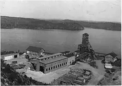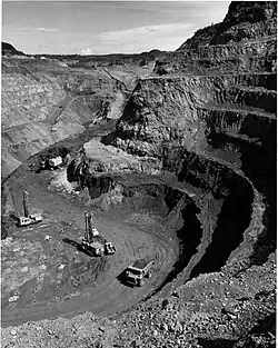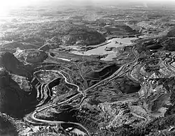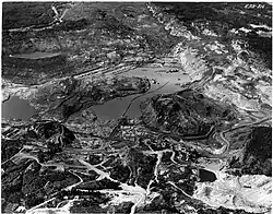 During World War II, a program was implemented to drain the lake.[4] This diversion of the river allowed open-pit mining of hematite iron ore under the middle arm of the lake by Steep Rock Iron Mines Limited and the East arm was mined by Inland Steel Company through its subsidiary Caland Ore Company Limited. By 1949, the site was producing a million tons of ore per year and had an estimated 500 million tons of ore deposits.[5][6][7][8]