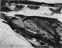 In March 1941, negotiations with the Ontario Government for the rights to dam off Steep Rock Lake were underway. The negotiations involved Steep Rock Iron Mines Limited, Ontario Hydro and Ontario-Minnesota Pulp and Paper Company. A special act of legislation was passed on July 27, 1942, called "An Act Respecting the Hydro Electric Power Commission of Ontario, Steep Rock Iron Mines Limited and the Ontario-Minnesota Pulp and Paper Company Limited."[16] This allowed Steep Rock Iron Mines to dam up the area surrounding the lake. By March 1943, financial arrangements were completed for the diversion plan and the project is started. Charlie Pitts and his construction company (C.A. Pitts Construction Co.) was hired to build the roadways to Finlayson Lake. Patrick Harrison and his crew were hired to dig the tunnel that would lower the water level of Finlayson Lake. On July 23, 1943, a plug is blown at the bottom of Finlayson Lake which leads into a tunnel connecting to the Seine River to lower the water level in Finlayson. Through the fall of 1943, three dams were constructed and the first pumps were put into action in the middle arm of Steep Rock Lake to dewater that section. By May the water level had dropped 75 ft. Raft Lake (situated between Finlayson and Marmion Lake) was also lowered to connect the two larger lakes together to complete the diversion plan. All through the summer and winter of 1943, millions of tons of rock, gravel and earth were moved. More than a million cubic yards of rock had to be removed to create the canal between Raft Lake and Finlayson. When completed, it was six hundred yards long, a hundred feet wide, and as much as ninety feet deep in places.[17] By the new year, Both Raft and Finlayson Lakes had been drained to the required levels, dams were built-including the dam between Marmion Lake and Raft Lake known as the Raft Lake Dam- and the cuts and canals had been completed. On January 28, 1944, the Raft Lake and Finlayson Diversion cuts were blown, which rerouted the water flow away from Steep Rock Lake. The lake was finally an isolated body of water and the job of pumping and mining the lake bottom could begin.