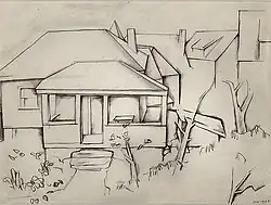 Hirsch's drawing, House, of 1920 shows some influences of Cézanne and the cubists in its juxtaposed panels and emphasis on the two-dimensional surface of the paper. Its spare, geometric design was typical of his style during this decade. His painting, Lower Manhattan, of either 1920 or 1921, is one of his best-known pieces. It possesses the "essential flatness" of most of his output and shows his artistic skill in its overall design, coloration, and balanced tonal relations.[3][11][12][13]