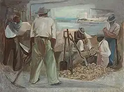 Hirsch's social realist style can be seen in Construction of Roosevelt Highway of about 1930 shows five dark-skinned laborers, none facing the viewer, all having postures showing resignation or despondence. Industrial buildings spewing smoke and a set of grain elevators appear in the background.