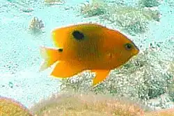 Juveniles are a much brighter yellow. They have a few tiny blue spots on the head and upper body, including one on the upper iris. They have three distinctive black spots, one at the junction between the dorsal fin spines and the soft rays, one dorsally on the caudal peduncle, and a third smaller one just above the base of the pectoral fins. These tend to have a faint blue rim, and the pectoral spot is absent in very young juveniles, becoming more prominent as the juvenile grows.[4]