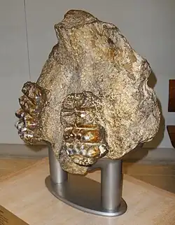 Stegolophodon is an extinct genus of stegodontid proboscideans. It lived during the Miocene epoch in Asia.[1][2][3][4][5] The earliest fossils are known from the Early Miocene, with one of the oldest fossils being from Japan, estimated to be 17.3 million years old. It is suggested to be the ancestor of Stegodon, and transitional fossils between the two genera known from the Late Miocene of Southeast Asia and Yunnan in South China. Like modern elephants, Stegolophodon developed proal jaw movement, where the lower jaw moves in a back-to-front motion, rather than the oblique chewing motion used by earlier proboscideans, with this development already present by 17.3 million years ago.[6] Members of the genus generally have tetralophodont molars, and retain tusks on the lower jaw. The upper tusks have an enamel band.[7]