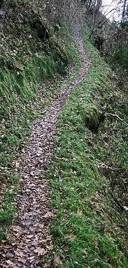 A steig (Low German: Stieg) is a German term meaning "trail in hilly terrain" or "steep path"[1] that originally referred to a narrow footpath over hills or mountains that could not be negotiated by horse-drawn vehicles. Today the term occurs in German-speaking countries as a synonym for all kinds of footpaths, e.g., Bürgersteig, a term for "pavement" in Austria or Switzerland. The term steig and its dialectical variations is commonly found in many placenames.