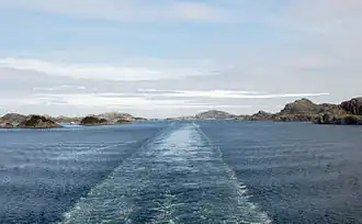 ![]() The Steinsund strait between the islands of Steinsundøy and Rånøy, seen from the boat MS Nordlys | |