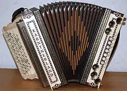 The Steirische Harmonika (Austrian German pronunciation: [ˈʃtaɪrɪʃɛ harˈmoːnika]) is a type of bisonoric diatonic button accordion important to the alpine folk music of Croatia (Hrvatsko zagorje), Slovenia, the Czech Republic, Austria, the German state of Bavaria, and the Italian South Tyrol. The Steirische Harmonika is distinguished from other diatonic button accordions by its typically richer bass notes, and by the presence of one key per scale row that has the same tone on both compression and expansion of the bellows, called a Gleichton. The bass notes earn the distinction Helikonbässe because they use bigger reeds with duralumin reed frames and a special chamber construction that amplifies its bass tones to give it a loud sound reminiscent of a Helicon tuba.