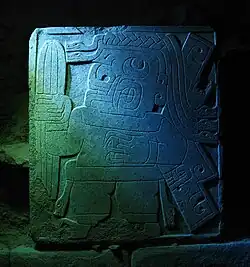 The stela of the cactus bearer is a monolith or stele of a single piece of granite, belonging to the Chavín culture of ancient Peru, which remains in its original location on the northwest side of the circular plaza at the archaeological site known as the ceremonial center of Chavín de Huántar in the Ancash region of Peru.[1][2] It was discovered during the 1972 excavation season by Peruvian archaeologist Luis Guillermo Lumbreras.