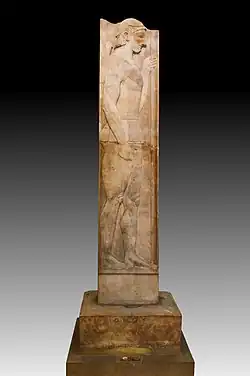 The Stele of Aristion or the Marathon Stele is a funerary stele in the National Archaeological Museum, Athens (NAMA, inventory number 29) which dates from around 510 BC. The work is among the best sculptures from late Archaic Greece. It is made of Pentelic marble and measures 2.02 m high. The stele was found with its base, which is 0.24 m high. The uppermost portion of the head and helmet is missing. At the top of the base is an inscription, giving the name of the deceased in the genitive: Ἀριστίονος "Aristion's".[2]