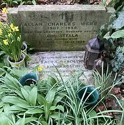 After the war, Allan Webb resumed his stage career with the role of Count Almaviva in the 1946 Sadler's Wells production of The Marriage of Figaro. In 1947 he appeared in the original run of the Vivian Ellis musical Bless the Bride, and made several further stage appearances in the following two years. During this time he had a brief affair with the actress Sydney Malcolm, for which Gibbons quickly forgave him.[64] He left the theatre in 1949 to become a director of a book club specialising in special editions, and later bought a bookshop in the Archway district of London.[69] His health failed in the late 1950s and in 1958 he was diagnosed with cancer of the liver. He died in July 1959 at Oakshott Avenue.[70][n 6]
