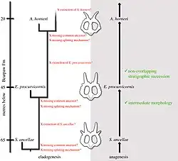 Stellasaurus is placed within the Ceratopsidae in the Centrosaurinae. The descriptors view the species as an intermediate between Styracosaurus albertensis and Einiosaurus, and not closely related to Rubeosaurus ovatus (which the describers consider to be a species of Styracosaurus). The authors dismiss an interpretation of the evolution of ceratopsids in these formations as a succession of divisions. They see this as a violation of the requirement of parsimony. After all, every split presupposes the existence of a last common ancestor, a splitting mechanism, a second branch that has left no fossils and the extinction of that branch. In comparison, a model of direct ancestry would be much simpler. It is usually objected to this line of reasoning that given the existence of a second branch, the ancestor and the extinction are already implicit and thus do not make it more unlikely. In addition, there is an infinity of possible splits. Indeed, the no-split model is more likely than any of the split models, but that's not to say it's more likely than the total of those models. That would depend on the a priori probability of a split, something about which little data is available.[1]