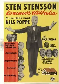 Sten Stensson Returns (Swedish: Sten Stensson kommer tillbaka) is a 1963 Swedish comedy film directed by Börje Larsson and starring Nils Poppe, Hjördis Petterson and John Norrman.[1] It was shot at the Täby Studios in Stockholm. The film's sets were designed by the art director Per-Olav Sivertzen-Falk. It was the fourth in a series of films featuring Poppe in the title role of Sten Stensson.