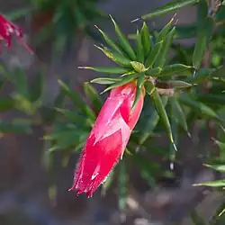 Stenanthera conostephioides, commonly known as flame heath,[2] is a species of small shrub that is endemic to south-eastern continental Australia. It has linear to lance-shaped leaves, red, tubular flowers and green, oval fruit turning dark red.