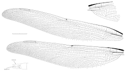 (1) a long not zigzagged secondary longitudinal convex vein in the postdiscoidal area, parallel to MP, the base of this vein being just distal of the discoidal triangle; (2) Cr long or very long, covering more than one or two cells between RA and RP; (3) pterostigma shifted basally; (4) pterostigma very long; (5) hindwing subdiscoidal space transverse and crossed by two veins or more; (6) the four wings elongate and more or less falcate; (7) forewing discoidal triangle long transverse; (8) numerous and well defined straight intercalary secondary longitudinal veins reaching posterior wing margin.[3]