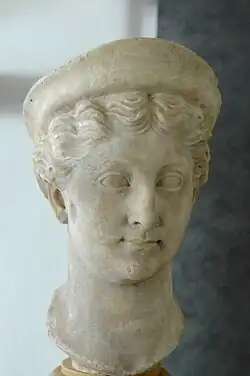 A stephane (ancient Greek στέφανος, from στέφω (stéphō, “I encircle”), Lat. Stephanus = wreath, decorative wreath worn on the head; crown) was a decorative headband or circlet made of metal, often seen on depictions of high-status ancient Roman and Greek women,[1][2][3] as well as goddesses.[4] The stephane often consisted of a metal arc that was higher in the center than along the sides. It was set atop a woman's hair, with or without a veil.[1] It resembled a crown.