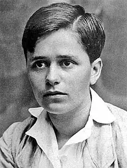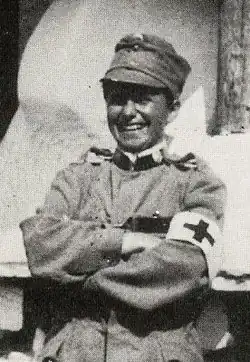 At the beginning of World War I, in Summer 1914, she completed a Red Cross Nursing training course.[6] She then went to Vorarlberg, where she joined the 2nd Dornbirn Battalion, Company II of the Standschützen under the male name "Stephan Hollenstein".[12] She dressed in male clothes[13] and was deployed to the Tyrolean war zone near Bolzano in May 1915.[6] Although her comrades-in-arms were aware of the deception regarding her gender, her superiors did not discover it for several months; in August 1915 she was sent home.[9]