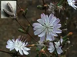 Stephanomeria diegensis is a species of flowering plant in the family Asteraceae known by the common name San Diego wirelettuce.[2] It is native to the coastal hills and ranges of southern California and Baja California, where it grows in many types of open habitat. It evolved as a hybrid of Stephanomeria exigua and S. virgata.[3] Furthermore, it is thought to be the result of homoploid hybrid speciation, which is uncommon.[4] The plant is frequently misidentified as one of its parents, especially if older taxonomic keys are used.[5] This is an erect annual herb easily exceeding two meters in height. Its slender stem has many spreading branches. The basal leaves are linear to lance-shaped and up to 10 centimeters long. The leaves wither early and are absent for most of the year, giving the plant a twiglike appearance. Leaves on the upper stem are small and reduced. The inflorescences are usually clusters of flower heads located at intervals on the stiff branches. Each head has a cylindrical base lined with phyllaries. These are often glandular. The head contains several ray florets, each with an elongated tube and a white or pink-tinged ligule measuring around a centimeter long. The fruit is a grooved achene tipped with a spreading cluster of long, plumelike pappus bristles.