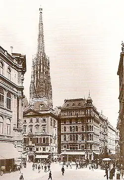 At the end of the 19th century, the entire square and its immediate surroundings underwent a redesign with increased building density. (Demolition of the area around the neighboring Brandstätte, moving back the building line at Stock-im-Eisen-Platz, removal of the Schmidlinsches Haus, etc.). In this context, Stephansplatz also briefly became a retail center, featuring the Rothberger department store and Anton Kranner's commercial building.[4]