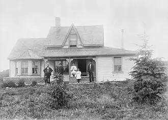 Additions to the small home were largely made as needed and as finances allowed. Stephansson, although well known for his poetic works later in life, was not wealthy and made a meagre income as a farmer, supplemented by other temporary employment. The first major addition was made in 1893, following the birth of Stephansson and Helga's sixth child, a son named Gestur. His birth prompted the construction of several additional rooms to the small log home which was becoming increasingly cramped. Two rooms on the north side of the home for Stephansson's mother Guðbjörg and daughters Stephaný and Jóný were added, alongside a study, a front room, and a sleeping quarters upstairs for the boys.[9][10] The home was further enlarged over the course of 1898, with a new kitchen complete with a pantry being added to the eastern side of the home. A new bedroom for Stephaný and Jóný was added on the south side, allowing the two rooms on the north side to be occupied solely by Guðbjörg.[11] These additions required the constriction of a completely new roof, and it was at this time Stephansson also added a veranda and bay window.[10]