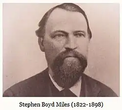 Colonel Stephen Boyd Miles (January 9, 1822 – October 30, 1898) was a frontiersman, stagecoach magnate, cattle rancher, banker and philanthropist in Nebraska and the greater American Midwest. His obituary in the Falls City Journal stated, "Mr. Miles was a man of great business ability and accumulated much of this world's goods, and left a fortune gained by hard effort, much of it literally dug in the sweat of his brow from the virgin soil of a new country."[1]