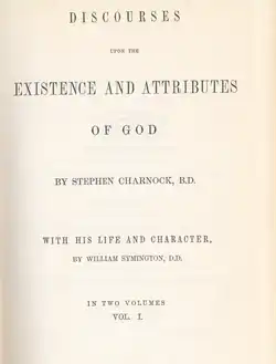 Nearly all of the numerous writings attributed to him were transcribed after his death. Charnock's theological fame rests chiefly in his Discourses upon the Existence and Attributes of God, a series of lectures delivered to the members of his congregation at Crosby Hall; unfortunately, however, the Discourses were cut short by Charnock's death in 1680. The treatise is preserved today as The Existence and Attributes of God, first published posthumously in 1682.